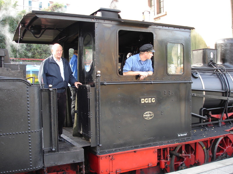 Und wie könnte es anders sein, dass unter den Reiseteilnehmern auch ein früherer Lokomotivführer war, der nicht unmittelbar mit der Reisegruppe in den vorreservierten Abteil seinen Platz suchte. Denn sein Platz war auf der Platte der Lokomotive, so wie er es schon aus seiner Ausbildung heraus gewohnt war.
