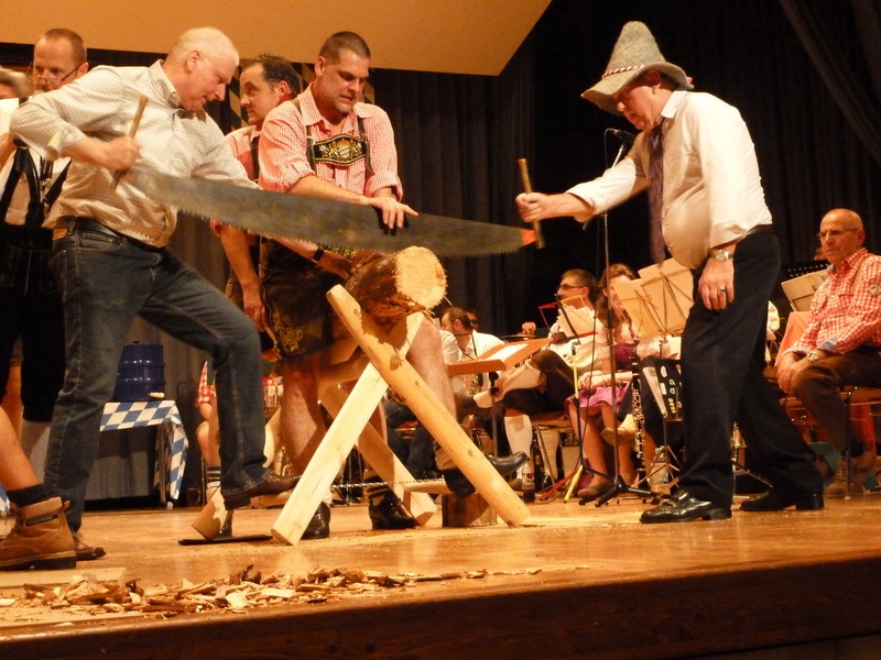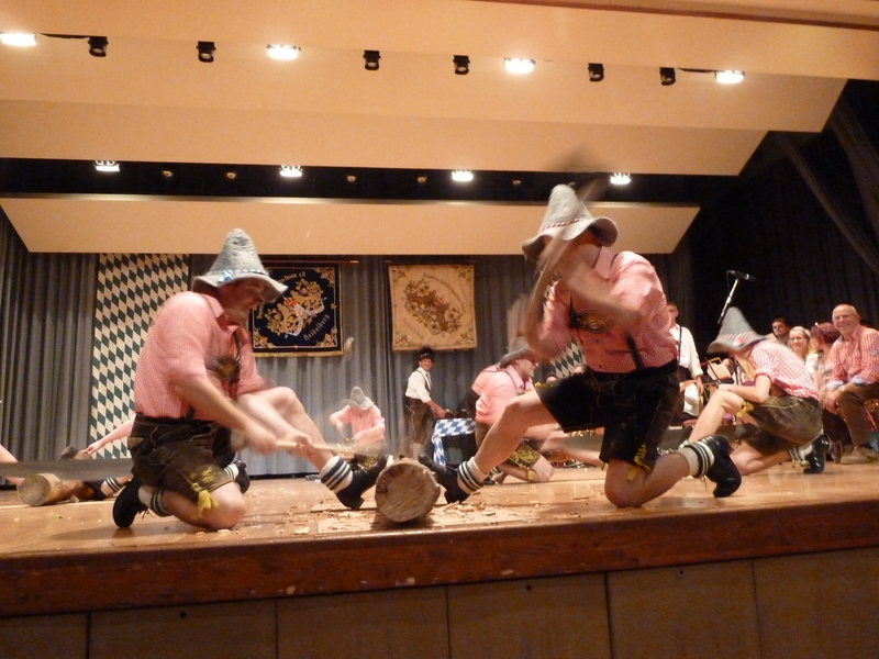 Baumstämme auf die Bühne und zeigten, was echte Holzhackerboam sind. Zuerst wurde gesägt, beim anschließenden Schlagen mit der Axt flogen die Holzstücke durch die Gegend und den Damen in den