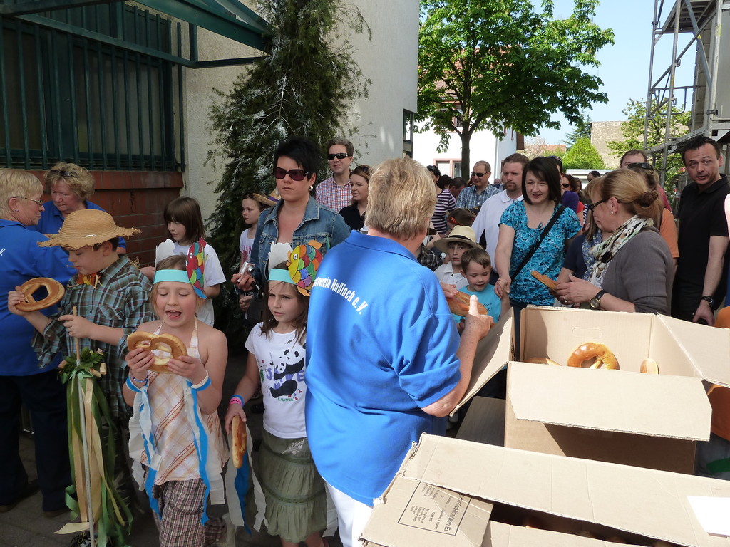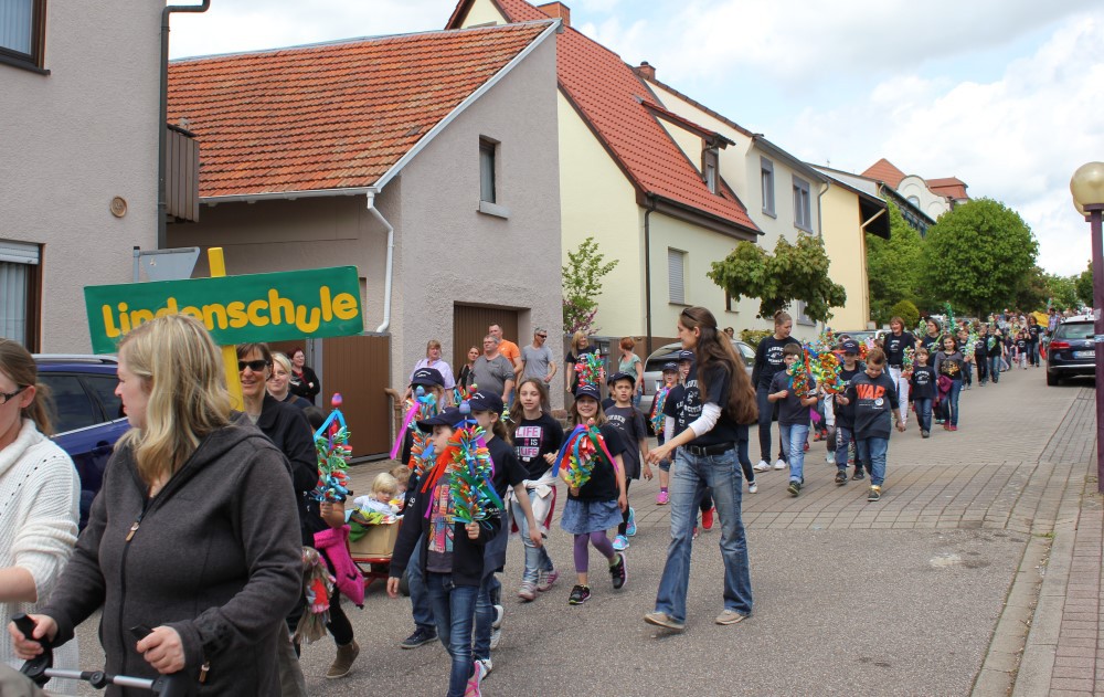 Im Schleifpfad vor den Toren der Lindenschule und der Olympiahalle wurde allen teilnehmenden Kindern die von der Gemeinde gestiftete Sommertagsbrezel überreicht.