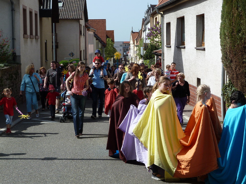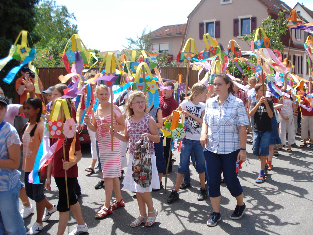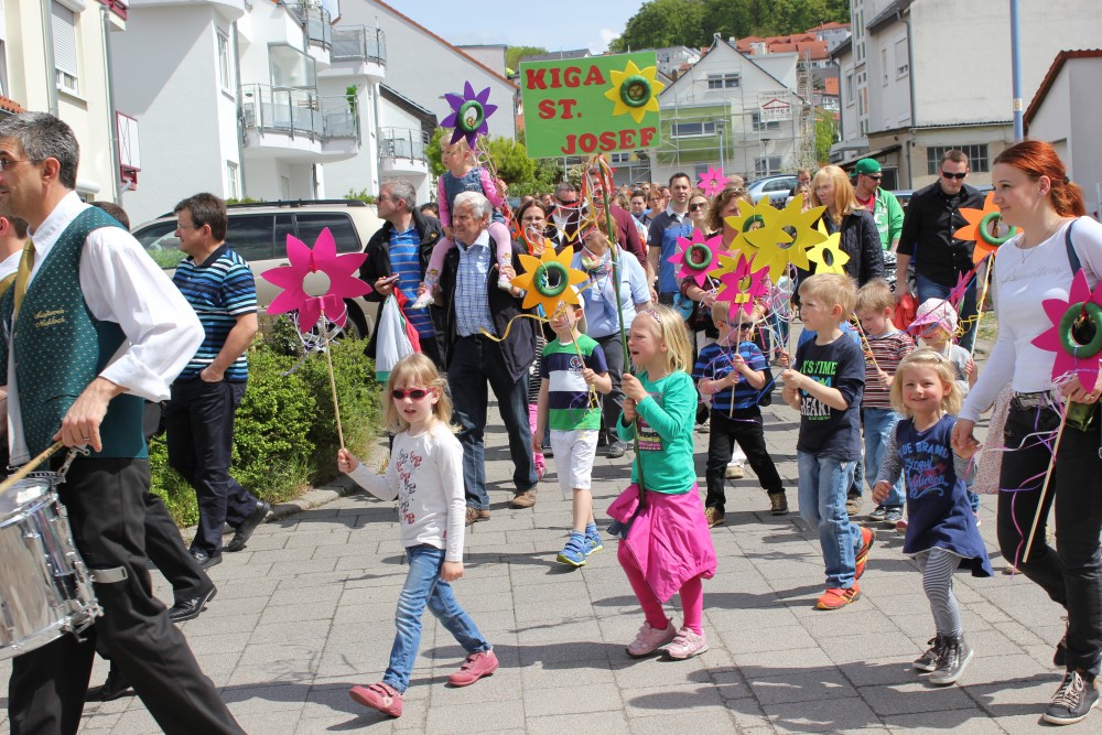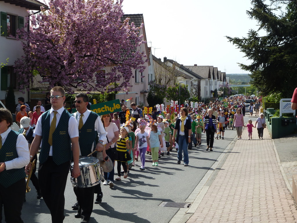 Angeführt von den zwei Butzen, dem Winter und dem Sommer, und der Musikverein Feuerwehrkapelle zogen die Kinder des Fröbelkindergartens als Sonnen mit Sonnen-stecken durch die Straßen, eine bunte Sommerwiese stellte die Lindenschule dar. Aus dem Paul-Gerhard-Kindergarten kamen kleine Raupen gekrochen, die Kinder-gärten St. Michael und St. Josef, zeigten dem geschlagenen Winter ihre Sommertagsstecken , während der Musikzug des Karnevalvereins die alten Lieder zum Frühling intonierte. Die kleinen aus dem Apfelbäumchen – Kindergarten hatten ihre Stecken natürlich mit Äpfeln versehen.