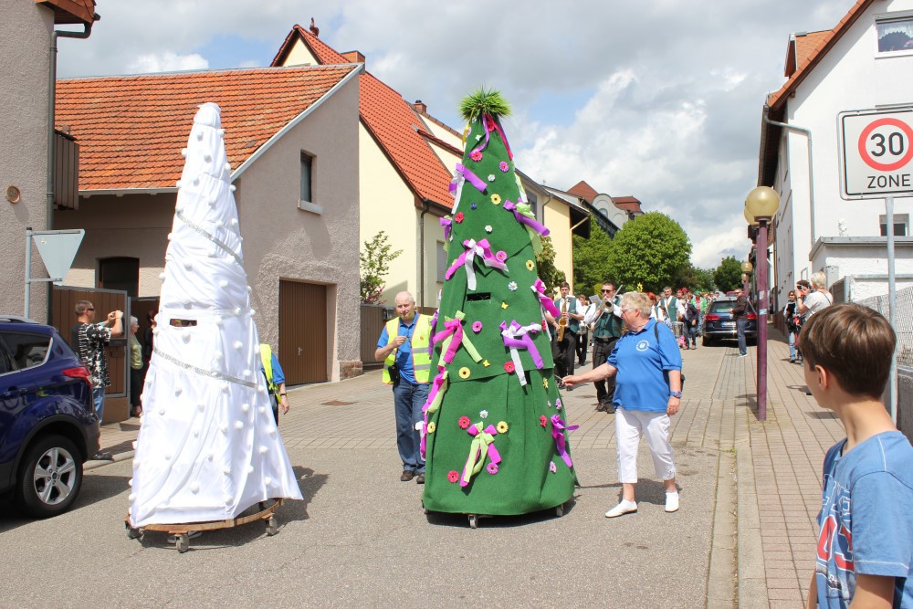 Die traditionellen Sommer- und Winterbutzen symbolisierten unter den Motiven die Zugspitze. Dahinter stimmte der Musikverein Feuerwehrkapelle Nußloch alle Teilnehmer und Zuschauer mit Sommerliedern
