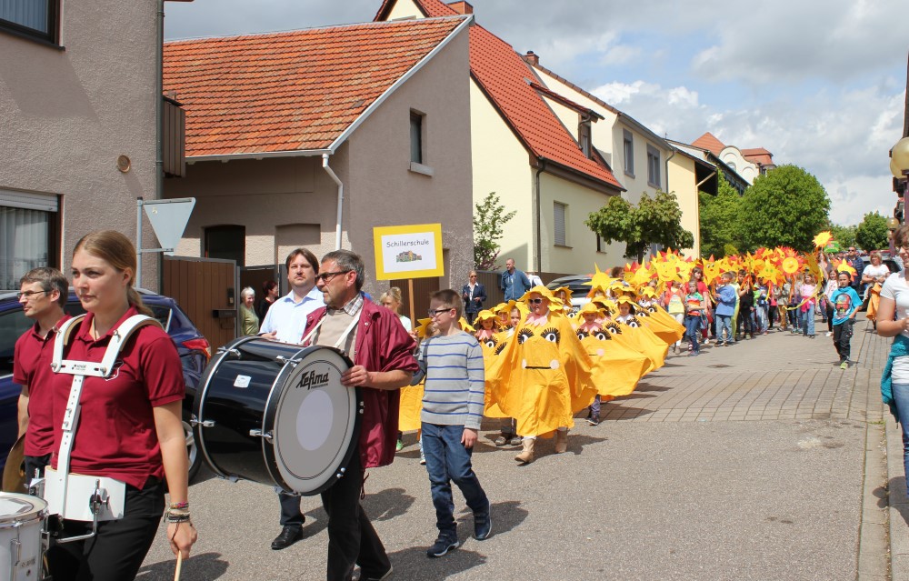 Als sehr große Motivgruppe präsentierten sich die Schülerinnen und Schüler der Schillerschule. Die erste bis vierte Klassenstufe verlieh dem Sommertagsumzug als Grashüpfer und Blüten, Sonnen,
